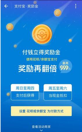 采寶支付最新消息:支付寶推獎(jiǎng)勵(lì)金服務(wù) 使用花唄余額寶支付最高獎(jiǎng)勵(lì)999元 經(jīng)常使用微信支付的小伙伴知道,微信掃碼支付后,有“鼓勵(lì)金”,可以在周末抵扣現(xiàn)金使用。